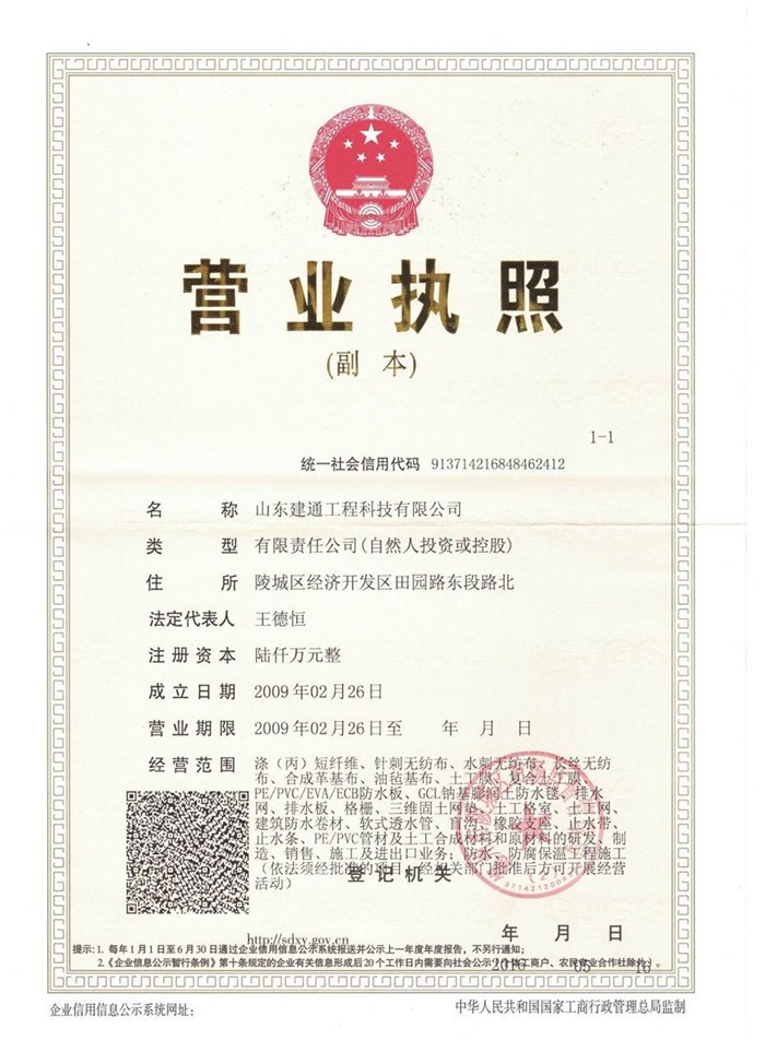 山東建通工程科技有限公司是以新型復(fù)合土工材料的生產(chǎn)制造為主,集防滲咨詢、技術(shù)咨詢、施工服務(wù)于一體的土工材料工程公司。公司注冊(cè)資本6000萬元,是我國目前規(guī)模較大的土工材料生產(chǎn)廠家之一。位于山東德州陵縣,地理位置優(yōu)越,交通運(yùn)輸十分便捷。